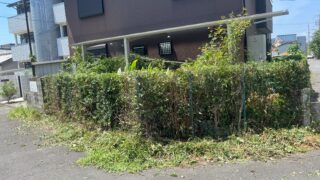 今までは住人の方がご自身で剪定をされていたそうですがこの暑さでできないとご依頼がありました隣のガレージまではみ出しているのでキレイに剪定をしていきます家の周辺の植木もいっしょに剪定をしていきます道路にはみ出さない程度にカットをしていき約2時...